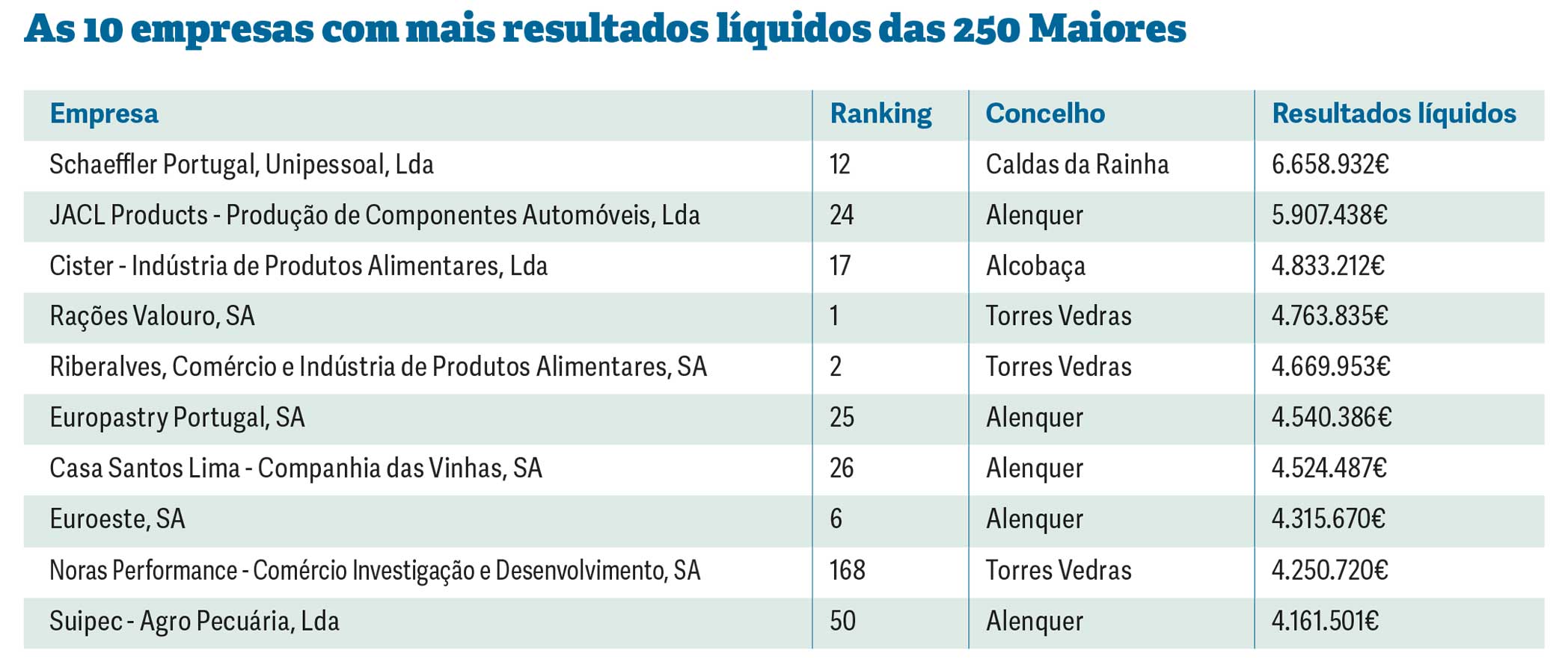 Com cinco empresas entre as dez maiores por resultados líquidos do Oeste, Alenquer lidera com grande vantagem esta lista no que diz respeito aos municípios, à frente de Torres Vedras, que conta com três entidades. Alcobaça tem uma entrada neste ranking, tal como Caldas da Rainha, embora, neste caso, o concelho se possa orgulhar de ter a entidade com maiores resultados líquidos da região.