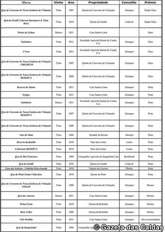 Nas lista dos vinhos premiados, o destaque vai claramente para o concelho de Alenquer, em cujas quintas têm surgido nos últimos anos boas produções vitivinícolas.