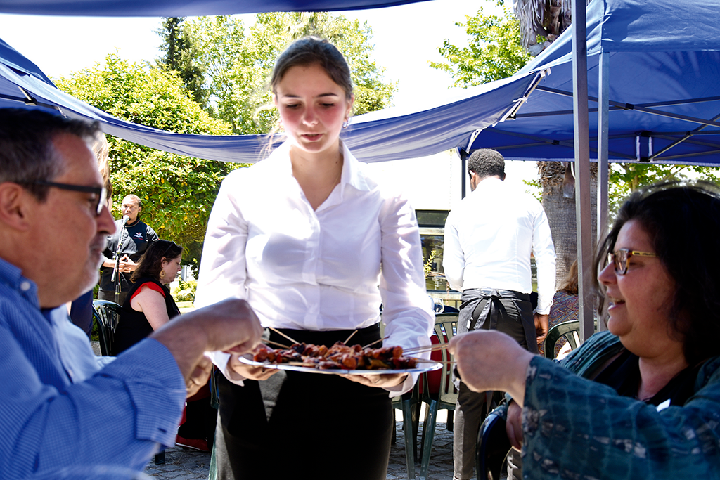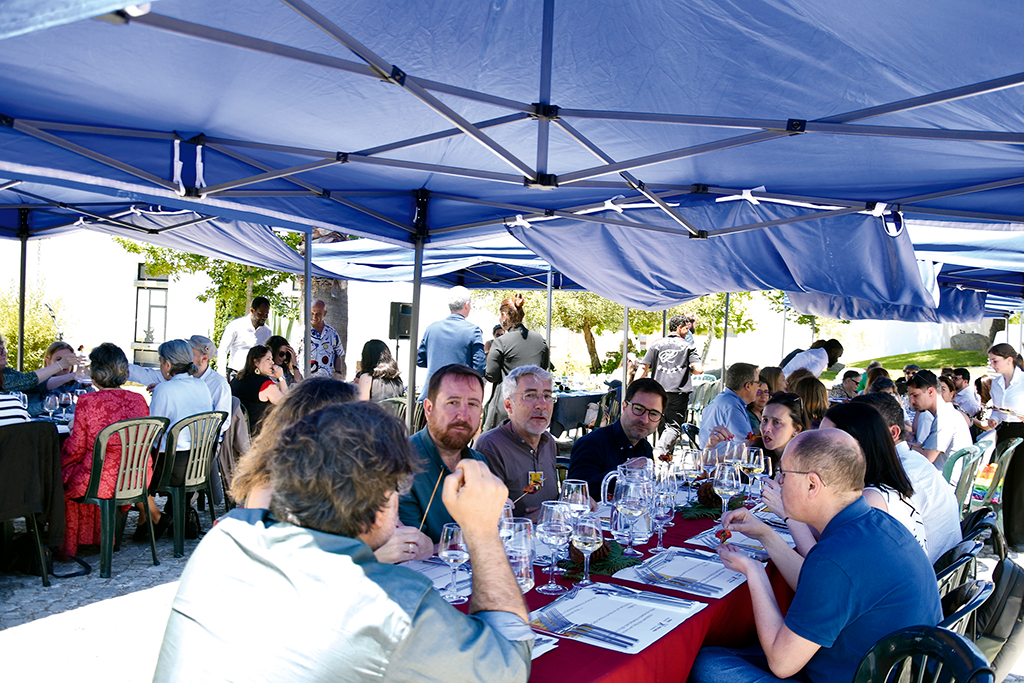 Parte dos jardins do Centro de Artes transformou-se numa “cozinha” e restaurante, na tarde de 7 de junho, ao acolher o evento “A Ferro e Fogo”. Organizado pelos cursos de Gestão e Produção de Cozinha e Gestão de Turismo, foi confecionado um menu, em que todos os pratos tiveram em comum o recurso ao fogo, degustado durante um almoço literário. Das espetadas de legumes na brasa, como entrada, ao folhado de pera Rocha do Oeste com mousse de ginja como sobremesa, os comensais puderam ainda saborear um robalo ao sal com mini legumes na brasa, uma barriga de porco na brasa, com puré de tremoço, cherivia frita e kimchi de pera Rocha do Oeste, e uma perna de javali na brasa com arroz de forno.