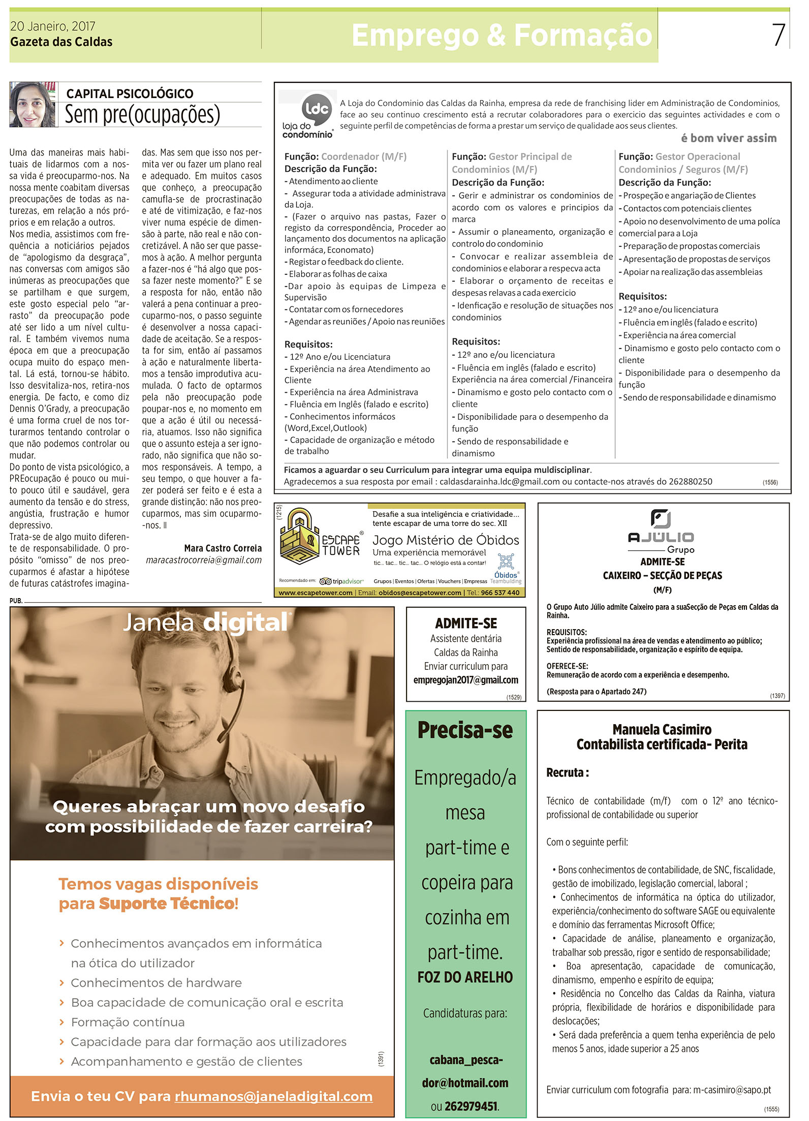 Emprego e Classificados Caldas da Rainha Classificados e Formação e Emprego Por Redação - 20 de Janeiro, 2017 0 1207 FacebookTwitterPinterestWhatsApp CLASSIFICADOS [showhide] VENDE-SE - publicidade - • Garagem Cidade Nova 963075086 ALUGA-SE • Vivenda T2 mobilada c/ quintal 262 877 143 FORMAÇÃO E EMPREGO emprego e formação [/showhide] - publicidade -