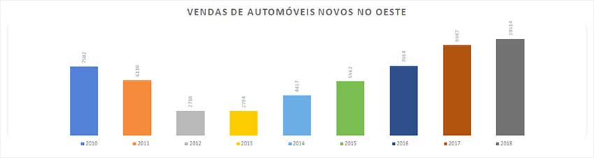 As vendas de veículos novos – incluindo ligeiros de passageiros, comerciais, pesados e tractores – atingiram em 2018 os melhores níveis desta década no Oeste, ultrapassando as 10 mil unidades. Os dados de 2019 ainda não estão disponíveis, mas apontam para uma estabilização.