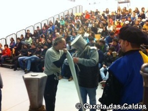 “Tenho o tempo do tempo”, diz Esmeralda, a protagonista do romance histórico “A Esmeralda do Rei”, de Paulo Pimentel. Num tempo tumultuoso – o séc. XII – em que as conquistas territoriais dominavam as atenções dos nossos reis, surge uma mulher que nos descreve o pulsar do dia a dia na Idade Média. Foi este o mote para que no dia 5 de fevereiro recebêssemos, da parte da manhã, a Federação de Esgrima Histórica, a Companhia Livre e a Associação de Esgrima da Rainha, que deram corpo ao que os alunos tinham lido no romance de Paulo Pimentel sobre o manejo de armas e as formas de guerra em Portugal, no séc. XII. Este grupo, que percorre o país a fazer recriações históricas, apresentou aos cerca de 150 alunos do 8.º ano da Escola Secundária Rafael Bordalo Pinheiro uma verdadeira aula viva de História de Portugal.