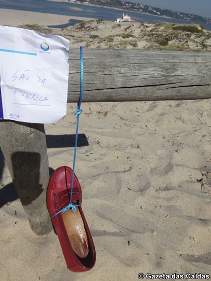 Mas, ainda que na imagem se destaque o sapato, o que me pareceu mais interessante não foi o sapato, mas sim a história em seu redor: 1) alguém ter pendurado o sapato com uma guita ao suporte em madeira, 2) esse ou outro alguém ter escrito o pequeno bilhete a dizer “são da Cinderela”, e o melhor de tudo 3) ainda que por segundos eu acreditei no bilhete, pelo menos o suficiente para me lembrar da história da Cinderela e imaginá-la a passar ali e a deixar cair o sapato…