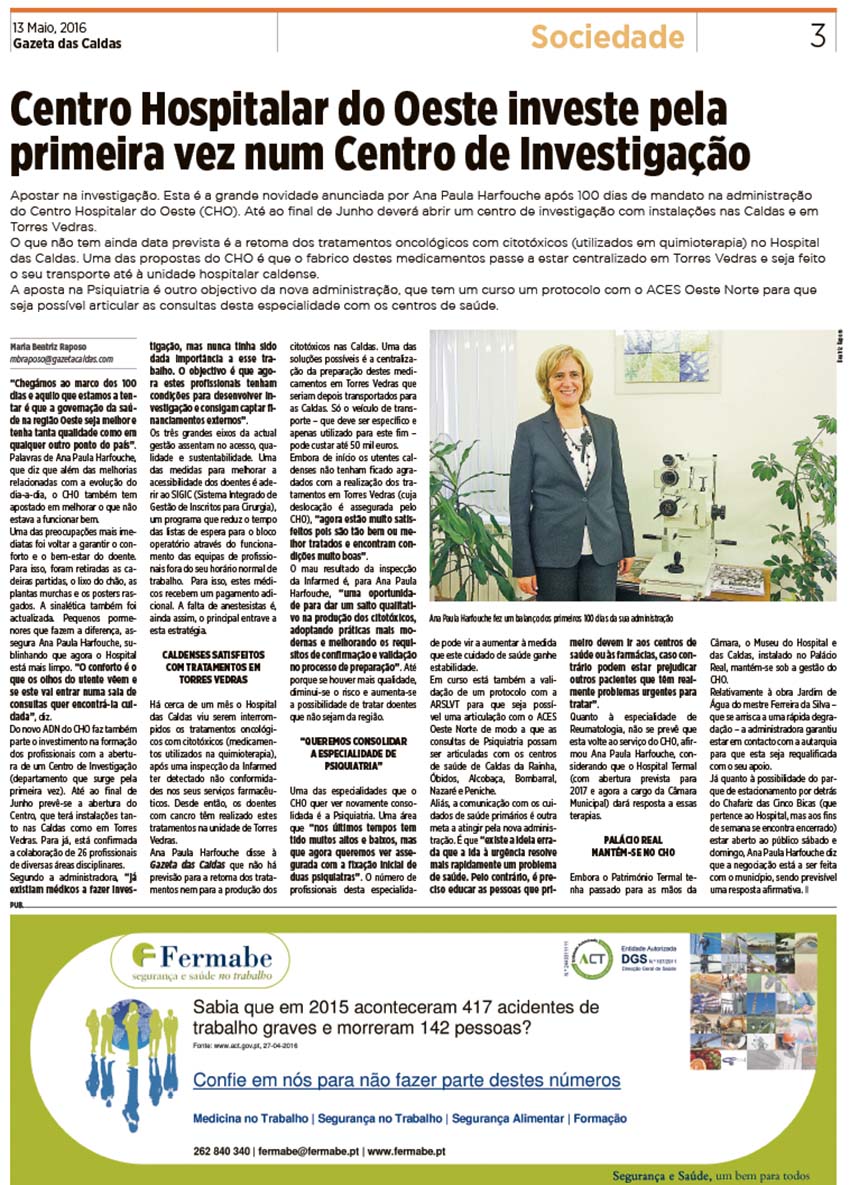Após a leitura da edição de 13 de maio da “Gazeta das Caldas”, a turma 8.º B da Escola Secundária de Raul Proença ficou intrigada pela notícia “CHO vai ter Centro de Investigação”, na primeira página, desenvolvida depois na página 3. Para além de todos sermos utentes do Centro Hospitalar, e portanto interessados no que acontece com o hospital, a ideia de um centro de investigação pareceu-nos estranha.