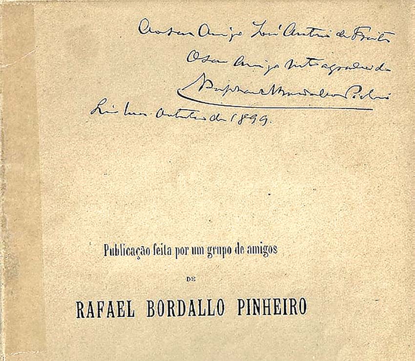 O meu exemplar tem um duplo valor, duplo qual quê!, quíntuplo ou sêxtuplo, pelo menos, porque na primeira página tem um dedicatória autografada de Rafael Bordalo Pinheiro “ ao seu amigo José António de Freitas, o seu amigo muito agradecido”, datada de Lisboa, Outubro de 1899.