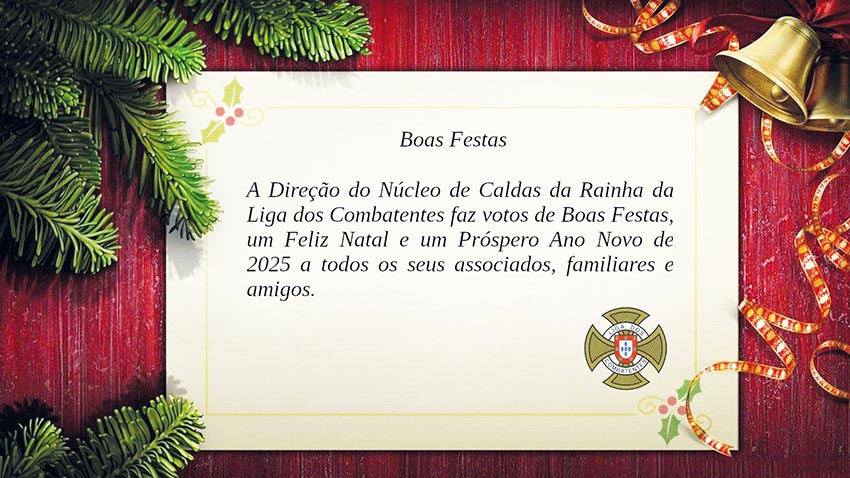 Em jeito de despedida do ano, deseja-se ao estimado leitor um Santo Natal, Boas Festas e um Ano de 2025 pleno de concretizações. Caso necessite, não hesite em contactar-nos através dos números: 913532075; 913534239; 262843142; do e-mail: caldas.rainha@ligacombatentes.org; caldas.rainha.ligacombatentes@gmail.com ou visitar-nos na nossa sede na Rua do Sacramento n.º 7, r/c esq. º 2500-182 Caldas da Rainha, a partir de 07 de janeiro de 2025!■