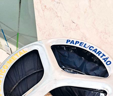 Na Rodoviária Nacional existe este mini Ecoponto supostamente para separar os metais, o vidro e o papel/cartão. O saco que recebe os materiais é...