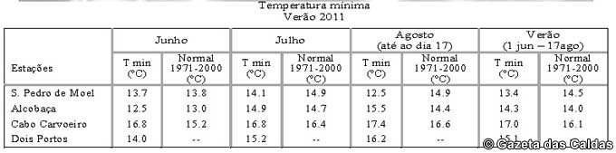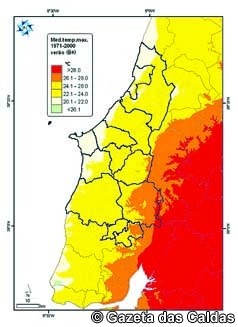 “É pois na temperatura máxima que se nota que a região Oeste está mais fria que o normal”, refere o Instituto de Meteorologia num pequeno estudo sobre o clima nesta região feito a pedido da Gazeta das Caldas. Isso faz-se notar em especial “se tivermos em consideração o verão de 2010, em que os meses de Julho e Agosto foram, respectivamente o primeiro e o segundo mais quentes desde 1931 em Portugal Continental, registando desvios em relação ao valor normal entre +1.5 e +3.0ºC”, refere o documento daquele instituto.