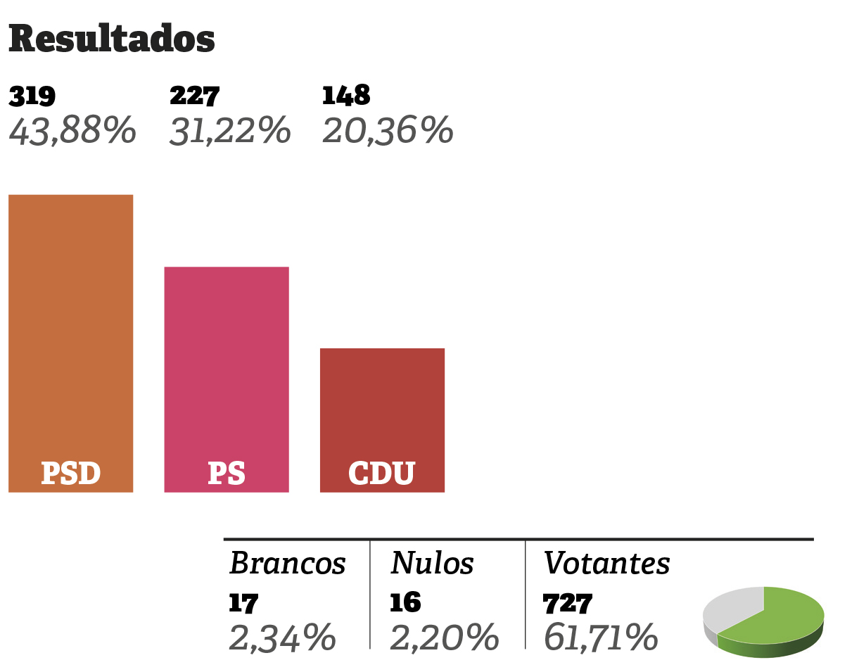 O PS regressa à Assembleia de Freguesia como segunda força política, com 3 mandatos e 31,22% (227 votos). Já a CDU perdeu 91 votos e um mandato, tendo obtido dois com 20,36% (148 votos). ■