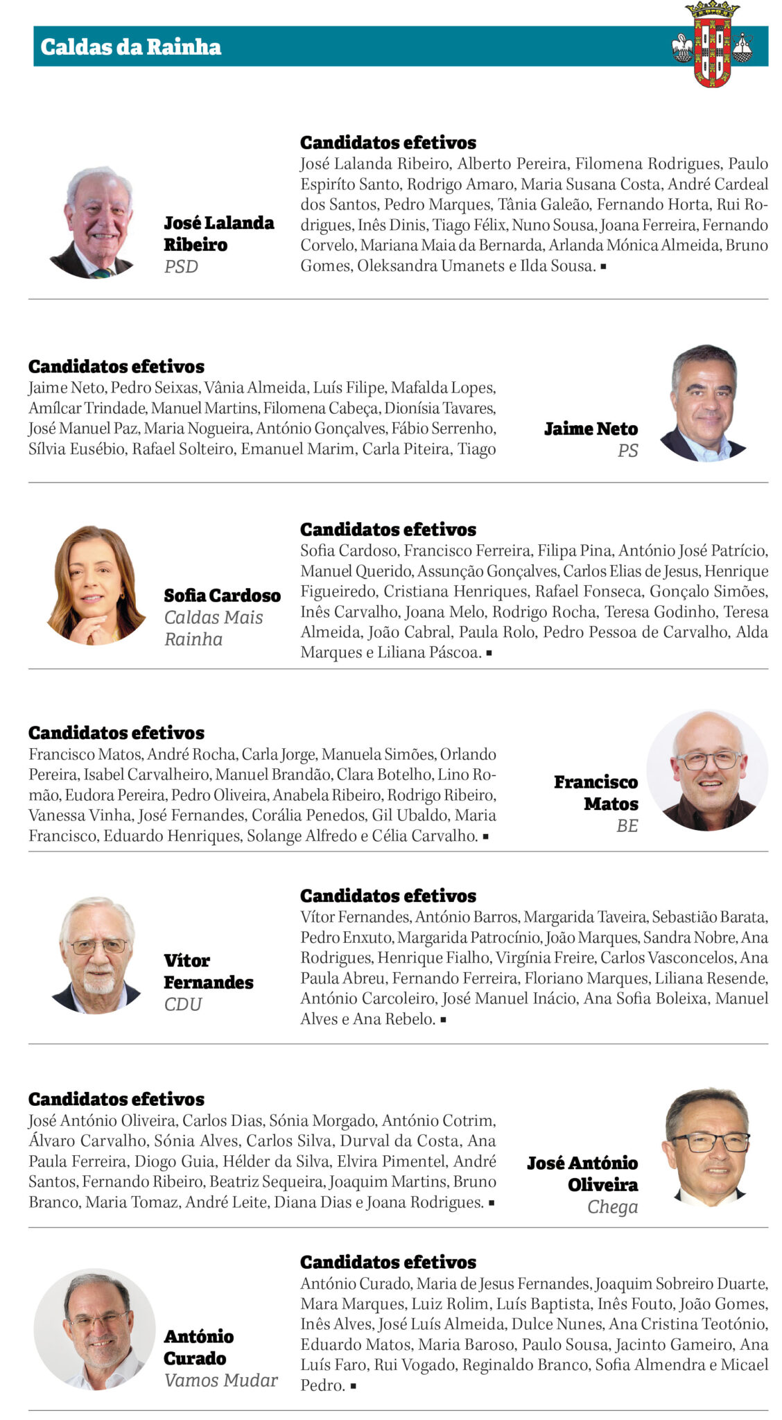 Nas Caldas da Rainha, apenas a coligação Caldas Mais Rainha vai a votos para a Assembleia Municipal com uma mulher. Trata-se de Sofia Cardoso, que disputará o eleitorado com José Lalanda Ribeiro (PSD), que se recandidata a mais um mandato, mas também com o vereador Jaime Neto, que avança pelo PS, o “repetente” Vítor Fernandes e os estreantes nestas andanças Francisco Matos (BE), José António Oliveira (Chega) e António Curado (Vamos Mudar).