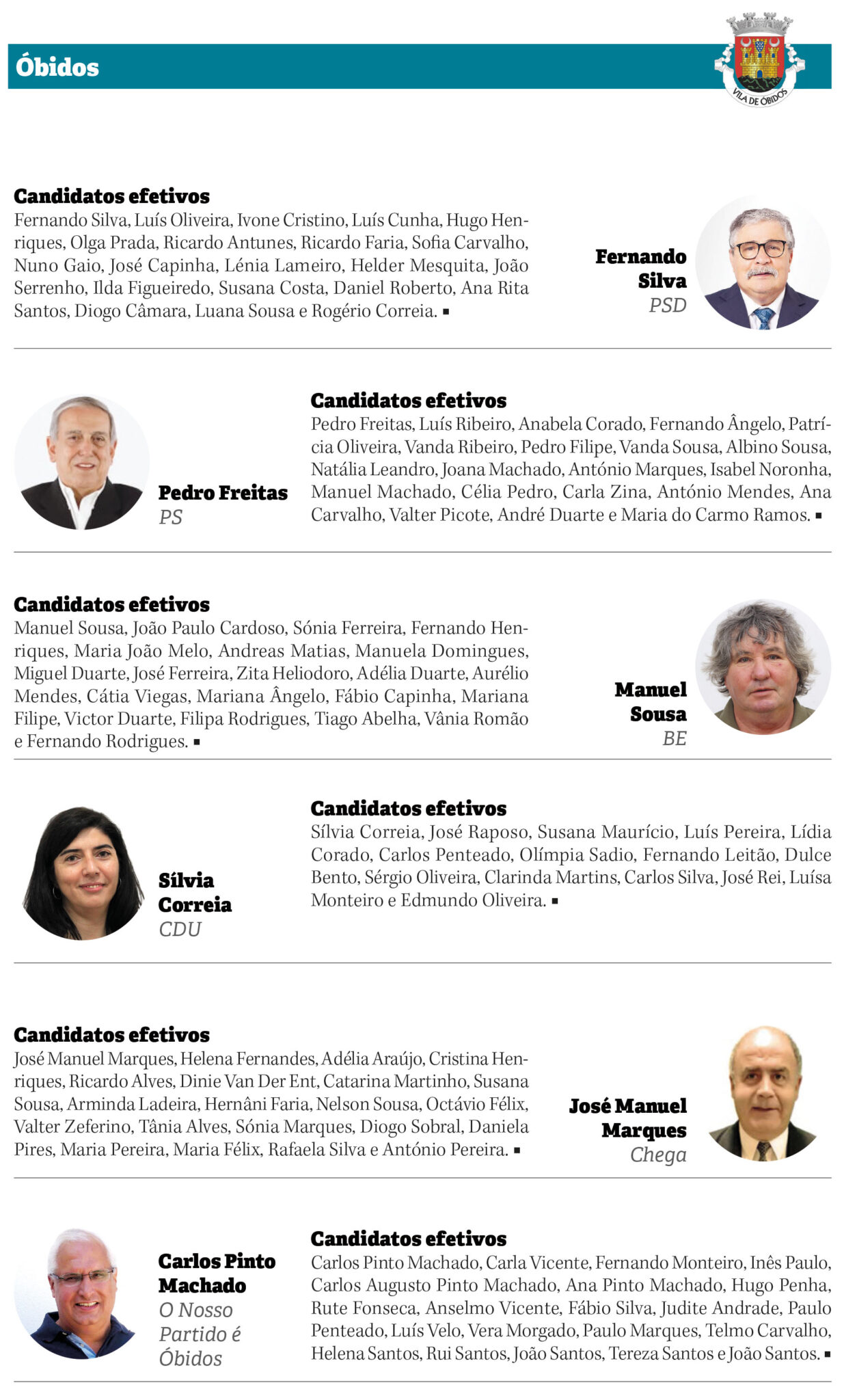 Em Óbidos, o cenário é em tudo semelhante. Sílvia Correia, cabeça de lista pela CDU, é a única mulher a liderar uma candidatura à Assembleia Municipal. Enfrenta Fernando Silva (PSD), que se recandidata a mais um mandato. E também é oponente de Pedro Freitas (PS) e José Manuel Marques (Chega), além de Carlos Pinto Machado (O Nosso Partido é Óbidos), que também é o cabeça de lista da coligação apoiada pelo MPT e pelo PDR à Câmara…