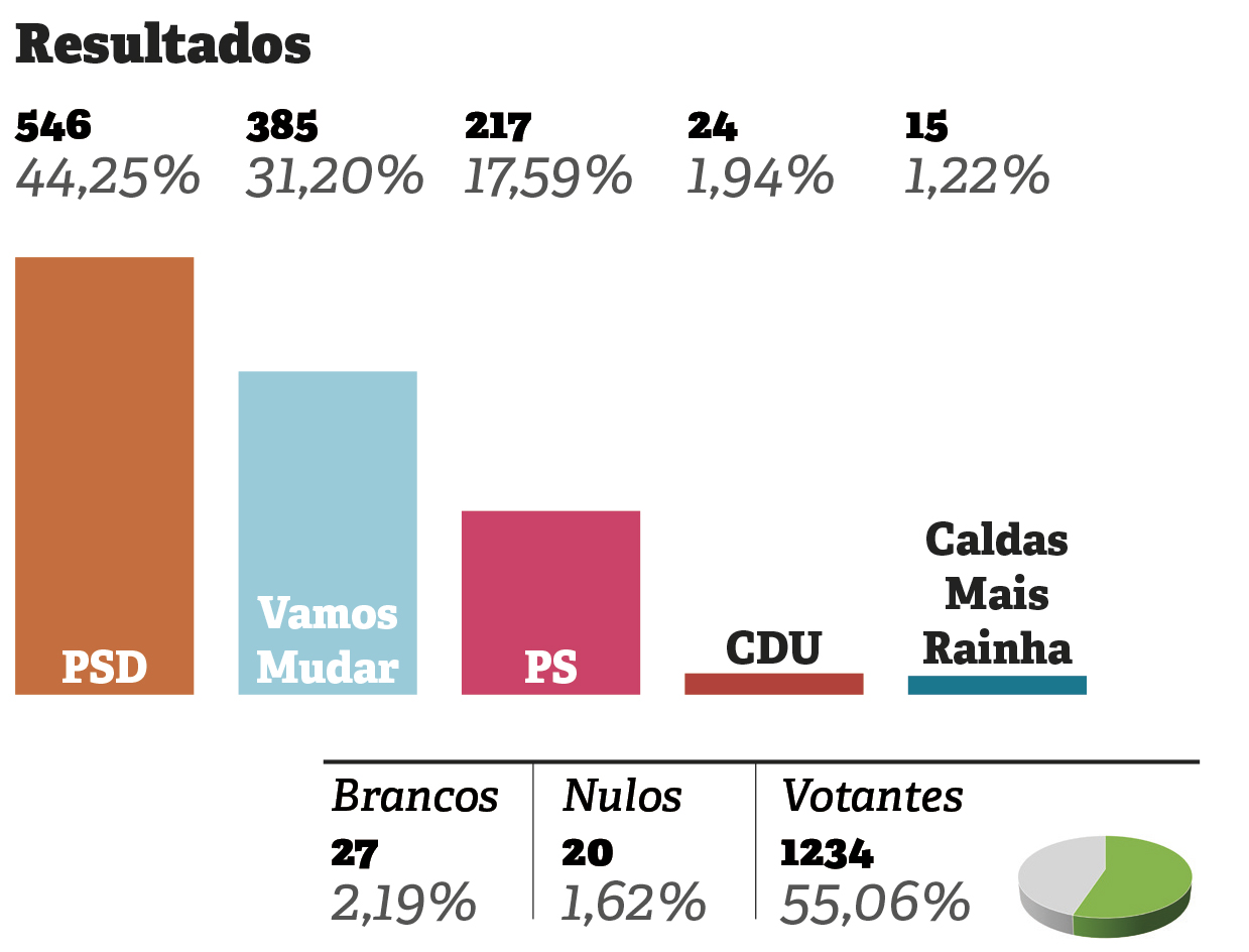Flávio Jacinto é o novo presidente da Junta de Freguesia de Salir de Matos, dando continuidade à supremacia do partido numa freguesia que era liderada por… Rui Jacinto. Os social-democratas sofreram uma perda significativa de votos, mas, com 44,25% (546 votos), salvaram a maioria absoluta, garantindo cinco eleitos. O Vamos Mudar, com 31,2% (385 votos), elegeu três membros para a Assembleia de Freguesia, enquanto o PS, com 17,59% (217 votos), reduziu de dois para um o número de eleitos. ■