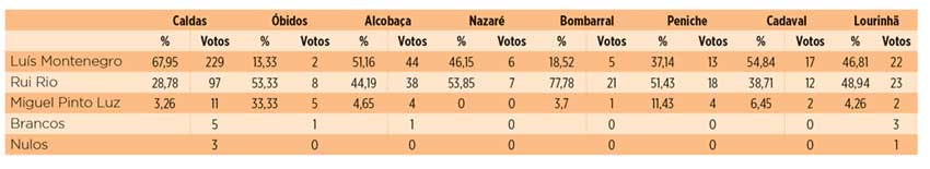 De resto, na região, os resultados foram muito díspares, com Luís Montenegro a dominar as votações nas Caldas da Rainha, mas também a vencer em Alcobaça, onde o presidente da Câmara, Paulo Inácio, formalizou o apoio a Rui Rio e o presidente da Concelhia, Paulo Mateus, esteve ao lado do antigo líder parlamentar. Luís Montenegro ganhou, também, no Cadaval, mas nas restantes Concelhias da região foi o antigo presidente da Câmara do Porto a dominar.