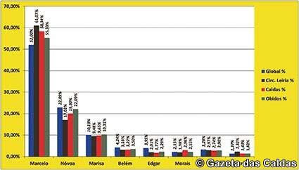 Óbidos aproxima-se mais da média nacional do que Caldas da Rainha em que a votação é mais acentuada favorável a Marcelo Rebelo de Sousa.