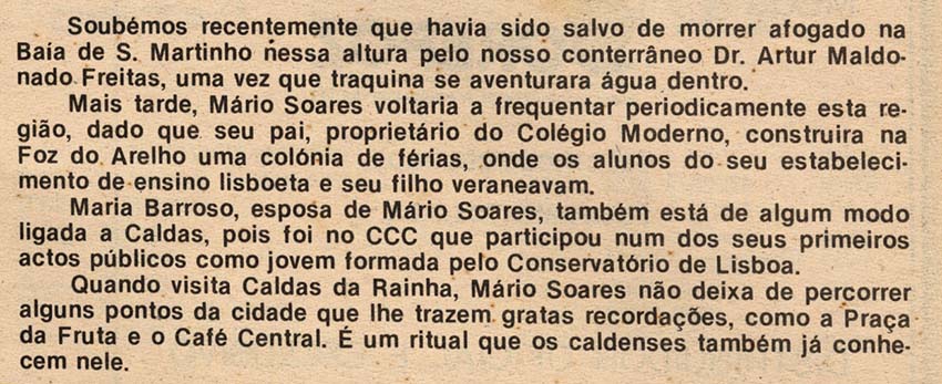 SoaresA Câmara das Caldas aprovou por unanimidade, na sua reunião de 9 de Janeiro, um voto de pesar pelo falecimento de Mário Soares. O executivo destaca as suas antigas e intensas relações do histórico socialista com este concelho, nomeadamente com a freguesia da Foz do Arelho. Desde a frequência sazonal da família nesta freguesia nos anos 30, à presença da estância de férias neste local para os alunos do Colégio Moderno durante as décadas de 40 e 50 do século XX, a figura de Mário Soares e sua família estarão sempre marcadamente associadas ao concelho das Caldas da Rainha, refere o documento aprovado pelo executivo. O mesmo refere que a presença de Mário Soares nas Caldas da Rainha ocorre “muito em função do sacrifício por vezes derradeiro que era exigido a todas as famílias com um histórico de luta contra o regime anti-democrático de Oliveira Salazar”. O seu pai, João Soares, foi deportado pela PIDE para os Açores e confiou o acolhimento do filho, então com cinco anos, à família Maldonado Freitas.