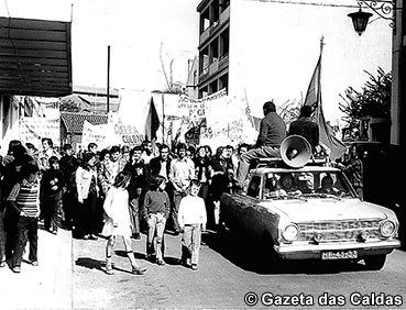 Conta ainda a Gazeta das Caldas de 8/5/1974 que foi “formado longo cortejo que desfilou pelas ruas da cidade com o maior civismo e ordem, entoando o hino nacional e empunhando cartazes, dísticos e bandeiras”. A foto que publicamos, da autoria de Carlos Gil (já falecido), é precisamente dessa manifestação relatada pela Gazeta.