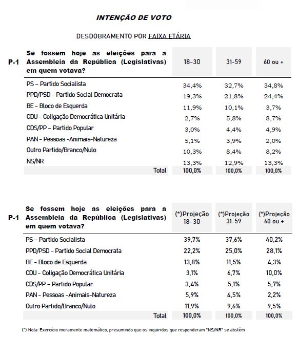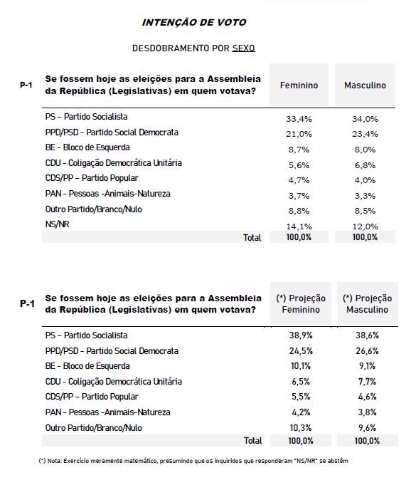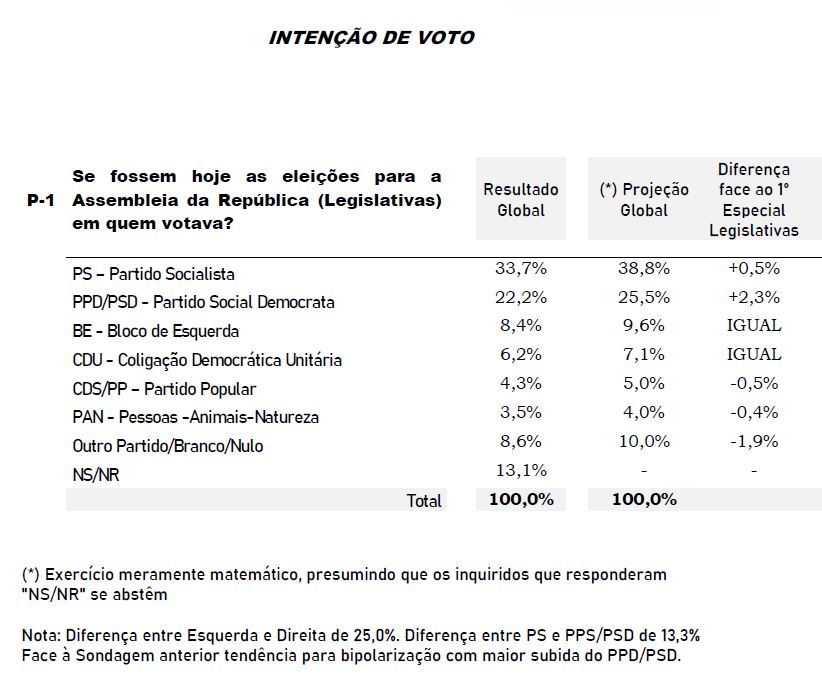 Estes dados consideram que os inquiridos que responderam não sabem ou não respondem se abstêm. Ainda segundo uma análise anterior feita pela mesma empresa de sondagem, verifica-se que houve uma tendência de subida para o PS com mais 0,5% dos votos, o PSD com mais 2,3%, mantendo-se as votações idênticas no BE e na CDU e descendo na CDS e PAN, como nos outros partidos concorrentes.. Não responderam 13,1% dos inquiridos.