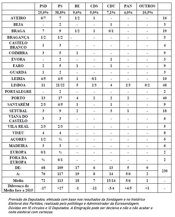 Em relação aos restantes círculos existem incertezas também em 10 círculos e na eleição de 12 deputados, sendo estimada uma progressão provável de 27 deputados do PS, a diminuição de 17 deputados do PSD, como de 1 deputado do BE, 11 do CDS e 3 a 4 da CDU, com o crescimento do PAN em 4 a 5 bem como de um nos restantes partidos.