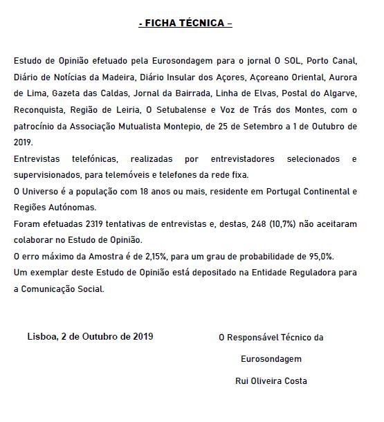 A sondagem baseia-se em entrevistas telefónicas, realizadas por entrevistadores selecionados e supervisionados, para telemóveis e telefones da rede fixa, entre 25 de Setembro e 1 de Outubro. O Universo da amostra cobre 2319 tentativas de entrevistas, com 2017  validadas e 248 recusas (10,7%), sendo o erro máximo da amostra de 2,15% para um grau de probabilidade de 95%. O responsável técnico pela sondagem foi Rui Oliveira e Costa e a mesma foi realizada para 14 órgãos de informação de todo o país.