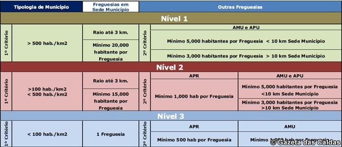 Os municípios serão divididos em três níveis. No primeiro nível estarão os concelhos com mais de 500 habitantes por quilómetro quadrado, no segundo os que tenham entre 100 e 500 habitantes e um último com menos de 100 habitantes por quilómetro quadrado.