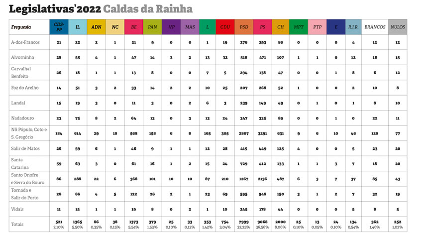 Com tendência de quebra no concelho estão duas forças políticas que, aliás, perderam representação autárquica nas Caldas em setembro: a CDU, que obteve 3,04% (754 votos), abaixo do que tinha obtido em 2019, e o CDS-PP, que registou 2,10% (521 votos), tendo perdido mais de metade do eleitorado.