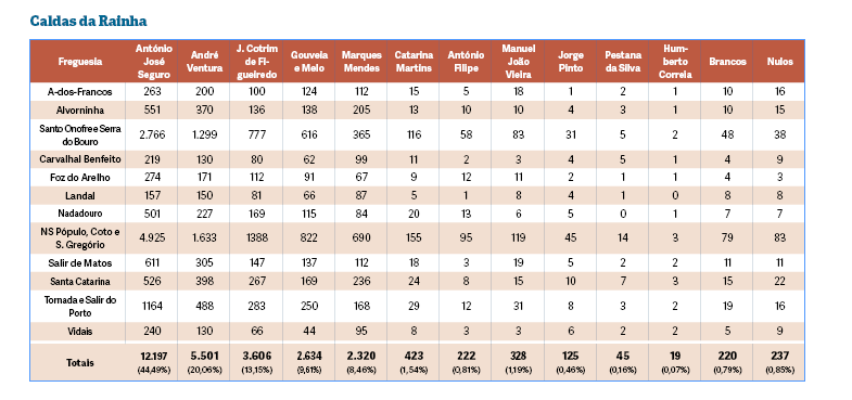 Foi o mais votado em todos os concelhos. Nas Caldas e Óbidos só não venceu numa freguesia, a Usseira, onde venceu Ventura. O líder do Chega aumentou duas vezes e meia a votação face a 2021