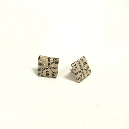 Brincos feitos com o papel de jornal transformado em formato de quadrados.