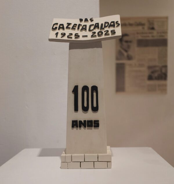Esta peça cerâmica celebra o centenário da Gazeta das Caldas, evocando a construção sólida de um jornal que atravessou gerações. Combina forma e simbolismo para representar um elemento que se ergue ao longo dos anos. Feito de tijolos e cimento uma metáfora para a base robusta sobre a qual a Gazeta se ergueu. Cada elemento da peça homenageia as pessoas que, com dedicação e talento, trabalharam e colaboraram com o jornal, bem como a comunidade que sempre lhe deu sentido e conteúdo. A prevalência da Gazeta até aos nossos dias é testemunho da sua relevância, da sua ligação ao território e da força coletiva que a sustenta há cem anos.