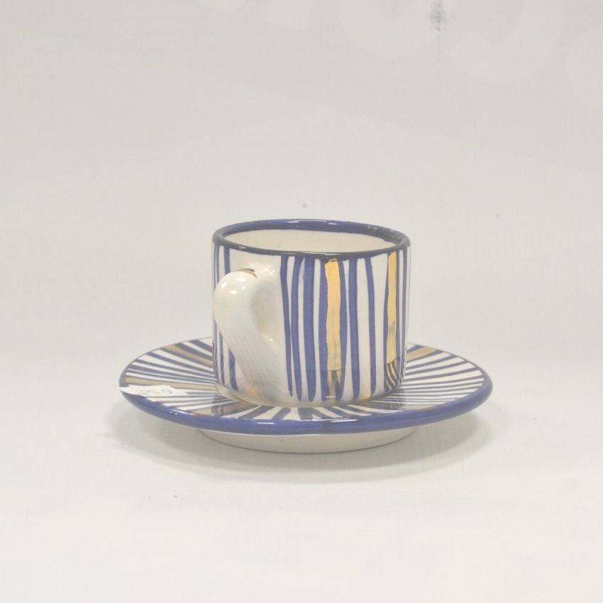 Conjunto de Chávena com pires em cerâmica, pintado com listas azuis e douradas. Podem encontrar mais peças da ceramista na nossa loja.