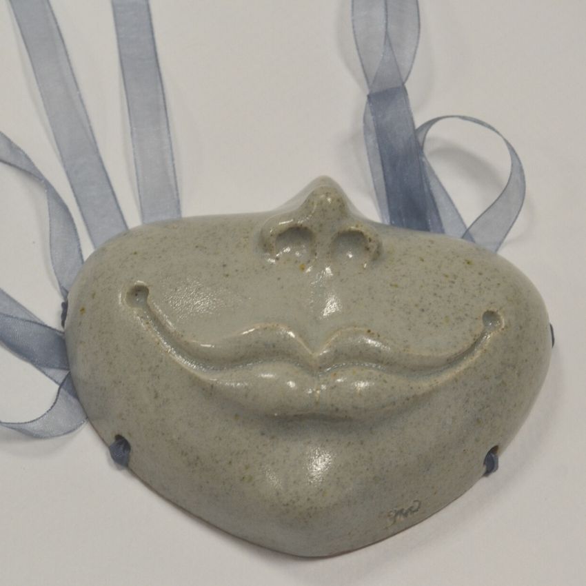 Mascara Sorriso cinzenta em cerâmica com fitas azuis em tecido. Uma peça elegante de decoração, da ceramista Paula Violante. Existem outras mascaras na nossa loja.