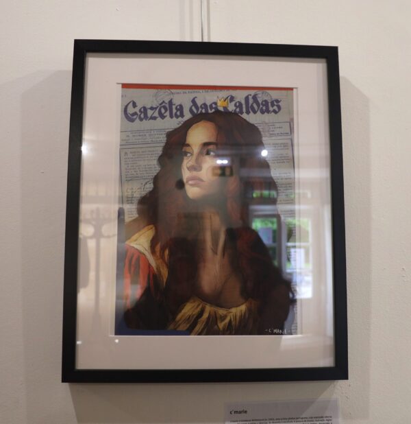 “Mulher cidade”, é uma ode à incontornável memória da Rainha Visionária que fundou as Caldas da Rainha. Nesta ilustração contemporânea, que mimetiza traços clássicos, emerge a figura imponente de D. Leonor, com um olhar firme e sereno, simbolizando não apenas a nobreza do seu espirito, mas também a força e determinação das mulheres que moldaram a história de Portugal. Como pano de fundo, uma antiga edição da Gazeta das Caldas – um jornal histórico da cidade, carregado de testemunhos do quotidiano local ao longo do tempo, que resgata o gesto de memória coletiva.