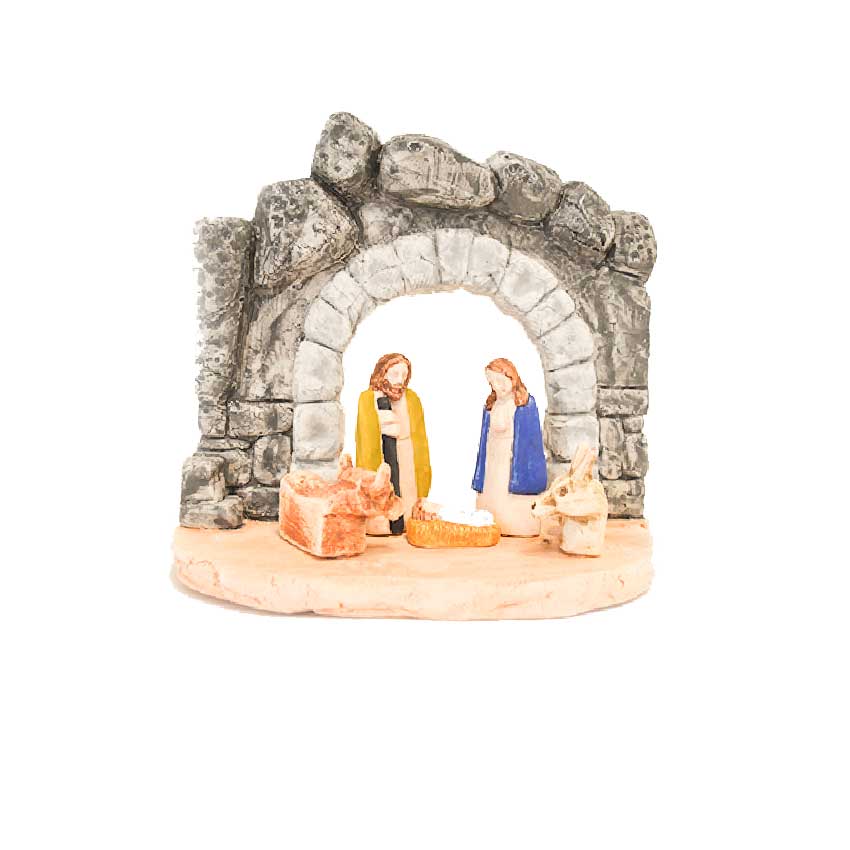 Presépio 5 figuras com telhado em cerâmica. O presépio para além das figuras, tem um pequeno arco atrás. Uma ótima ideia para decorar a sua casa ou para juntar à sua árvore de Natal. Existem outros presépios do mesmo autor na nossa loja.