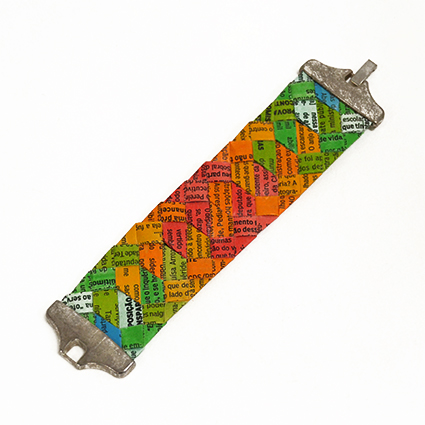 Pulseira larga feita com o papel de jornal transformado e com várias cores.