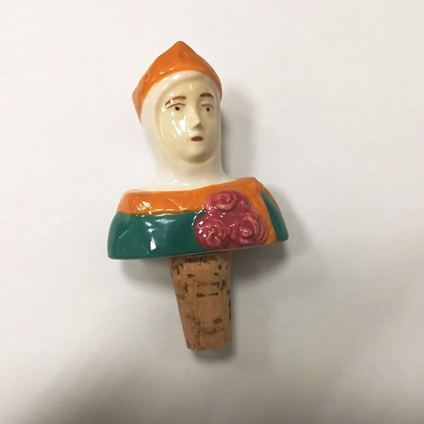 Rolha Rainha Isabel de cortiça. A peça tem a rolha de cortiça, mas a cabeça é a Rainha Isabel em cerâmica. Existem diferentes rolhas para escolher na nossa loja, inclusive outras rolhas com figuras de pessoas em outras cores.