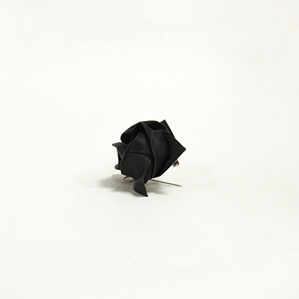 Pregadeira feita em origami com papel de jornal em forma de rosa com cor preta.