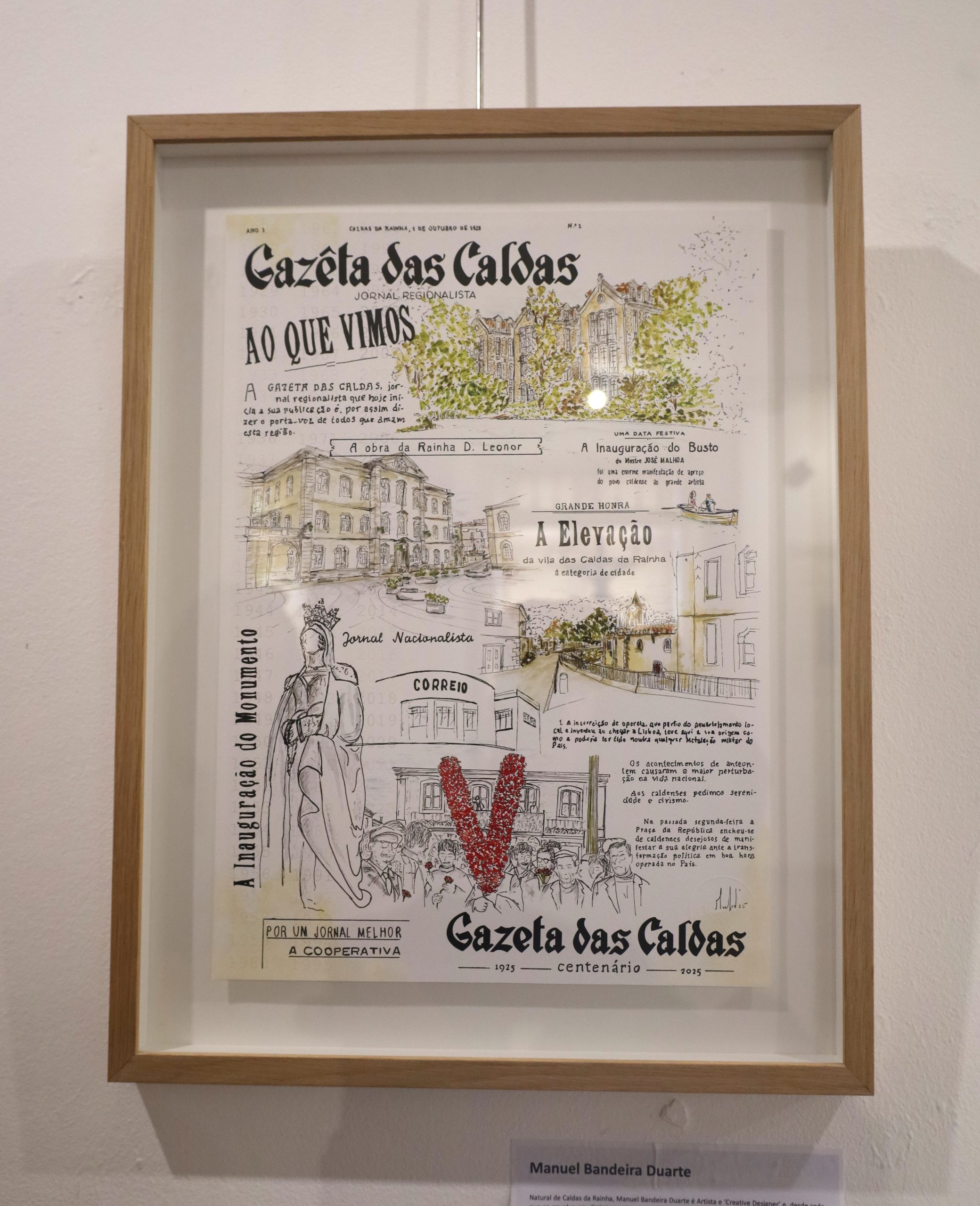 Atravessando diversas páginas, impressões e espaços, a composição enaltece variados alicerces que tanto distinguem este período temporal da “Gazeta das Caldas”, coexistente com o território onde se desenrola esta cronologia a cidade das Caldas da Rainha. Lado a lado, a composição sobreleva momentos, relatos e pontos-chave que personificam a vida dos dias de hoje, a nossa história. São cores que dão existência à passagem do tempo e que intensificam os traços vindouros.