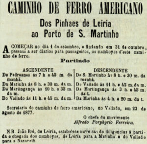 Inauguração do caminho de ferro americano de Pedreanes a São Martinho do Porto, cujo parte do traçado seria aproveitado para a Linha do Oeste