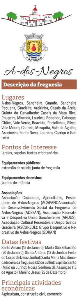 A freguesia de A-dos-Negros estende-se por uma área onde numerosos e pequenos cursos de água, afluentes do Rio Arnóia, deslizam pelos seus vales.