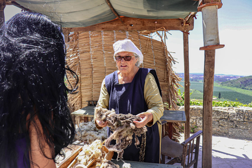 Ainda do lado de fora da cerca, encontra-se uma das novidades desta edição, o mercado da lã, que se desenvolve desde a ovelha até à curtição das peles, o aproveitamento do leite para queijos e da lã para fios de várias cores. Adélia Duarte é Maria da Lã, a tecedeira que aproveita o material proveniente da tosquia, limpa-o e enrola-o em fios. À Gazeta das Caldas conta que o que sabe, aprendeu a ver a mãe fazer, nos seus tempos de criança e vivia numa aldeia, com ovelhas, cuja lã era aproveitada para fazer as suas vestes. “Ainda tenho meias feitas pela minha mãe, que agora são uma relíquia, assim como uma peça de linho da sua última semeadura”, lembra, enquanto enrola os fios e vai explicando o processo aos curiosos que param frente à sua banca. Este é um dos espaços dinamizados pelos “Ofícios com história”, entidade formadora e curadora desta edição, que conta com 20 mestres e ofícios, uma granja com mais de 20 animais e uma equipa de 50 animadores de rua oriundos de vários pontos do país.