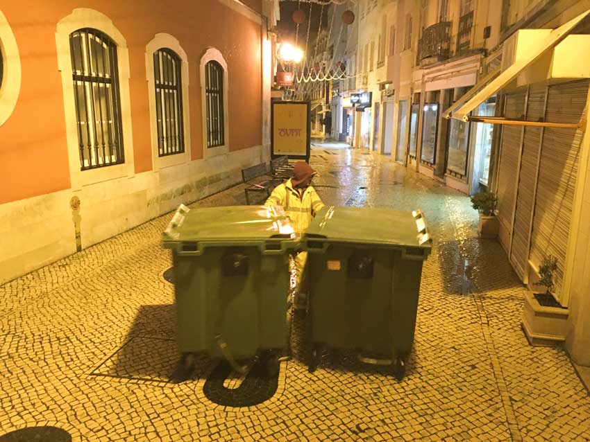 Ir e voltar às oficinas da Câmara demora meia hora e o serviço fica irremediavelmente atrasado. Ilídio Sancheira explica que há a preocupação de limpar o centro da cidade antes que o trânsito comece a ficar mais intenso. Até então quase não havia carros nas ruas.