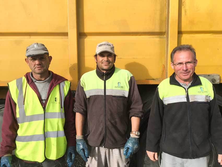 São três equipas que vão partir agora: duas para fazer as rotas da cidade e outra para as aldeias. O Scania que nos dá boleia vai fazer o centro das Caldas, a Encosta do Sol, a Crocha e os Casais de Santa Rita. É conduzido por Ilídio Sancheira, que chefia uma brigada com dois assistentes operacionais: Ângelo Gaspar e José Ferreira.