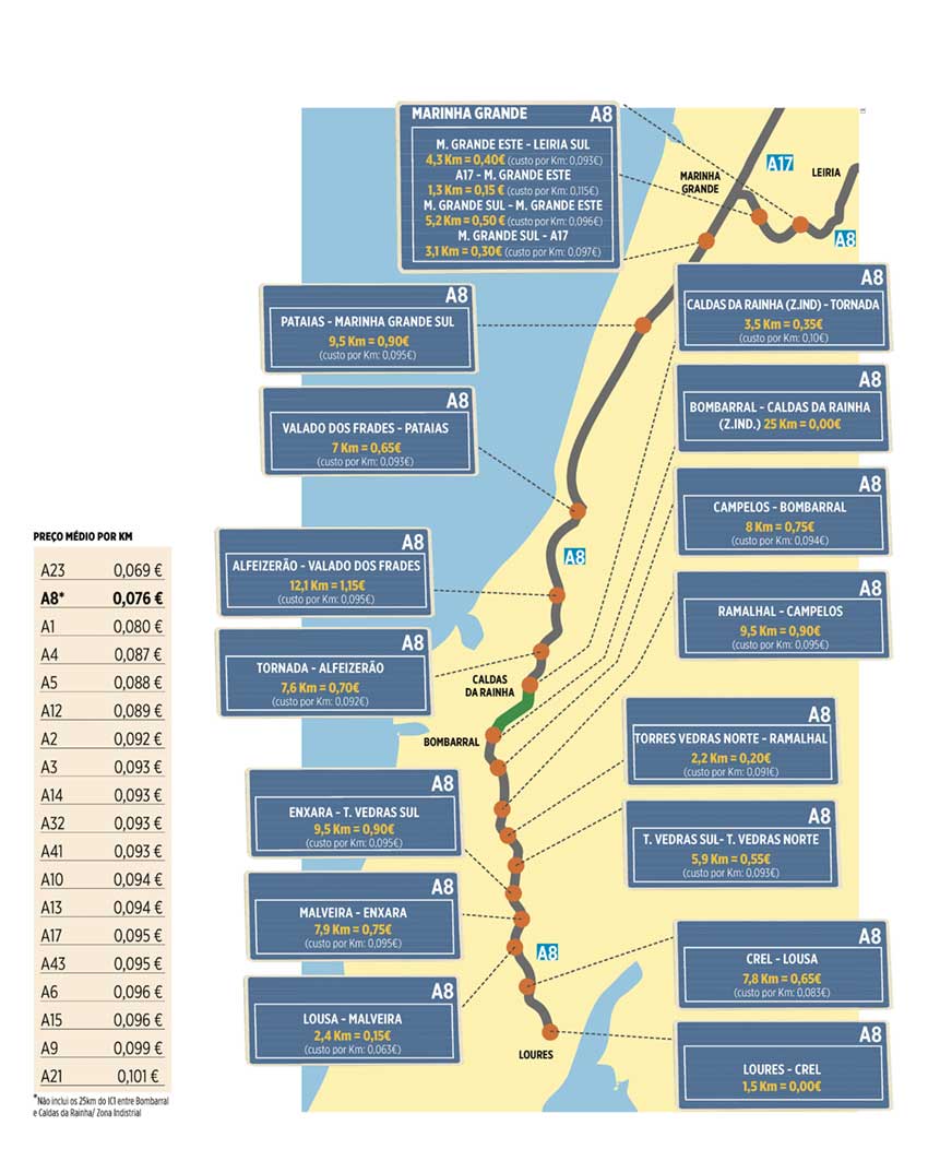 Desta forma, a A8 passa a ser mais barata que a A1 e apenas é superada no país pela A23, a auto-estrada da Beira Interior, cujo quilómetro tem um preço de 6,9 cêntimos para quem realiza todo o percurso entre Santarém e a Guarda.