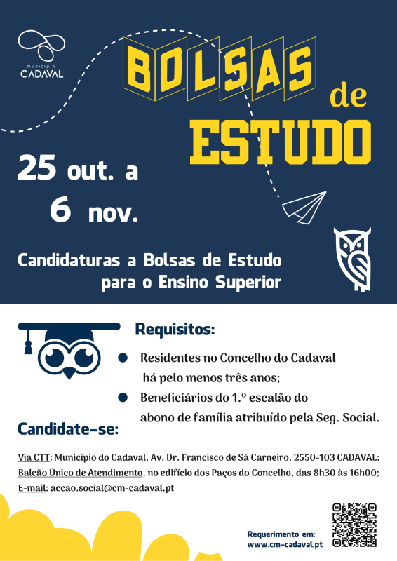 Desde dia 25 de outubro e até 6 de novembro, encontram-se abertas as candidaturas para atribuição de bolsas de estudo para o ensino superior por parte da Câmara do Cadaval. “Esta medida visa incentivar o prosseguimento dos estudos por alunos do concelho do Cadaval com menores recursos económicos”, refere a autarquia.