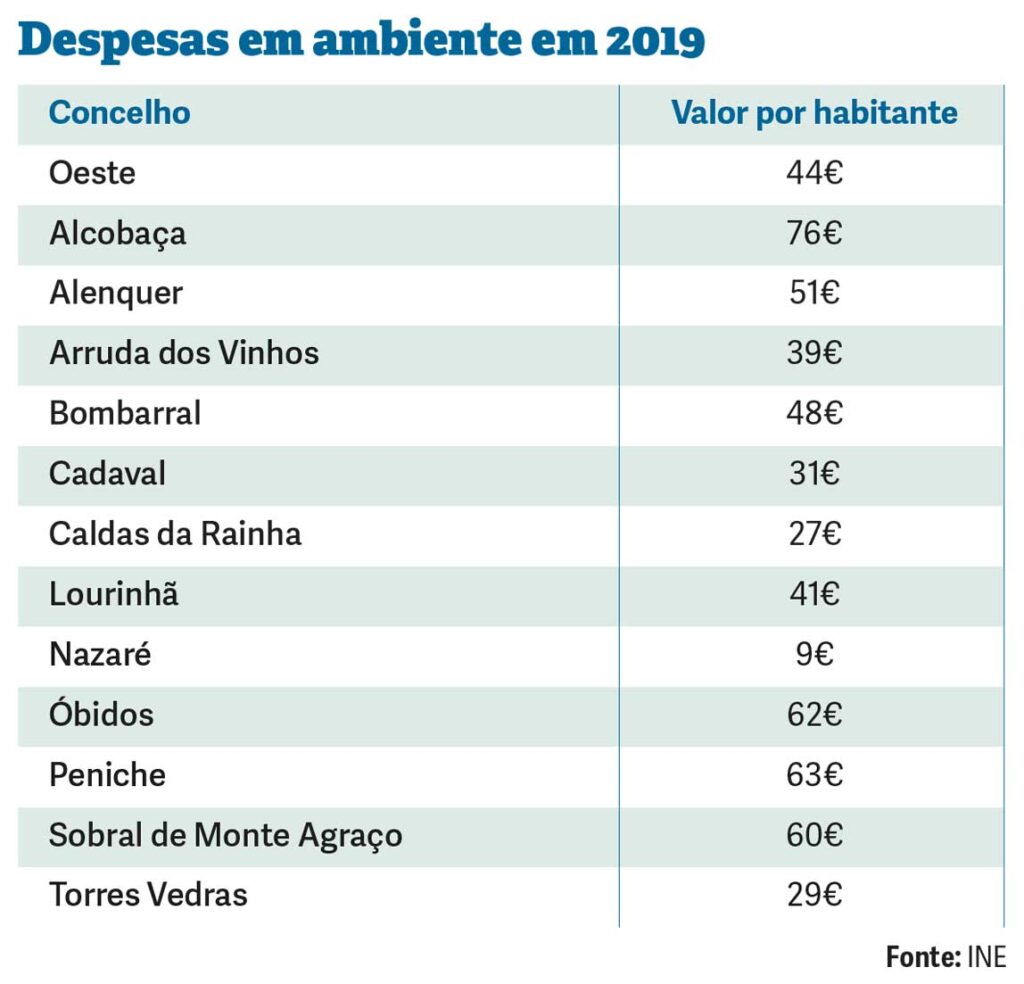 Relativamente à receita dos municípios por cada habitante nesta área do ambiente não há dados das Caldas nem da Nazaré. Dos dez existentes, Peniche é o que mais cobra no Oeste (54 euros por pessoa), seguindo-se Óbidos (41 euros), Lourinhã (37 euros) e Torres Vedras (31 euros). Os que menos cobram são Alenquer e Sobral de Monte Agraço, com 26 e 27 euros, respetivamente.