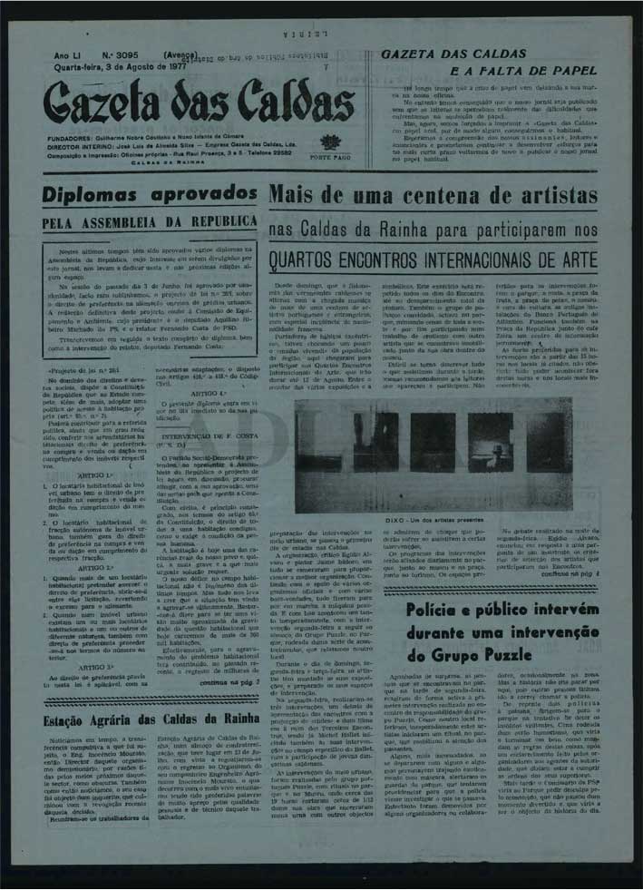 Caldas preparava-se para comemorar os seus 50 anos, quando uma centena de artistas, nacionais e estrangeiros, se reuniram para a realização dos IV Encontros Internacionais de Arte, por toda a cidade. Algumas das manifestações, mais de vanguarda, chocaram a população local, que ainda vivia os alvores da democracia. Gazeta das Caldas, num momento em que se debatia com problemas de falta de papel e em que as tecnologias ainda não permitiam revelações de fotografias instantâneas ou mesmo a publicação de muitas imagens, apresenta um suplemento de arte, inteiramente dedicado a este evento. Foi coordenado por Egídio Álvaro, que agradecia à Gazeta a possibilidade de “apresentar à população caldense um panorama daquilo que durante doze dias vai acontecer das propostas nacionais e internacionais que modificarão radicalmente o panorama artístico português”.