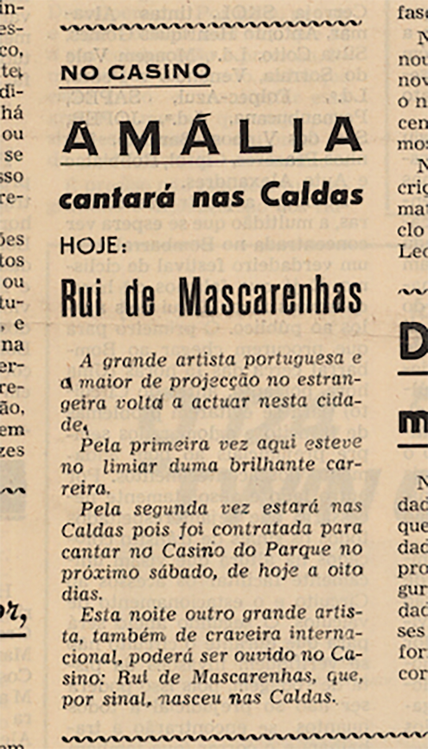 Amália já tinha cantado nas Caldas da Rainha antes desta actuação no Casino. No final dos anos 1940, a artista participou numa quermesse feita para angariar fundos para a construção da Igreja da Nossa Senhora da Conceição. A igreja, que é hoje a matriz da cidade, foi inaugurada em 1951. E, pelo que contou um antigo responsável do Casino, até teve um namorado na cidade…