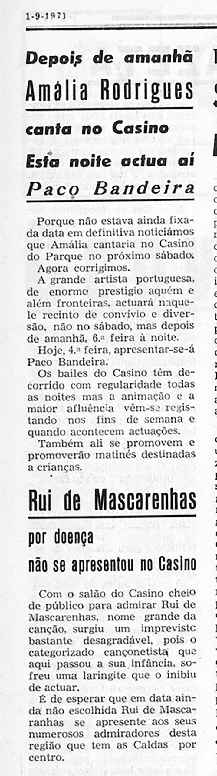 Amália ensaiou durante a tarde no Casino, a 3 de Setembro de 1971 para actuar nas Caldas no serão, conforme Gazeta das Caldas noticiou na semana passada. E é através das páginas deste jornal que passamos em revista a presença da diva na cidade.