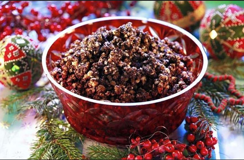 À mesa deixa-se de fora a carne. Aliás, os mais devotos cumprem uma quaresma de 40 dias até ao Natal, alimentando-se apenas à base de vegetais. Neste período, o peixe é permitido uma vez por semana, assim como no jantar da véspera natalícia. Da ementa fazem parte 12 pratos, numa homenagem aos 12 apóstolos de Jesus.