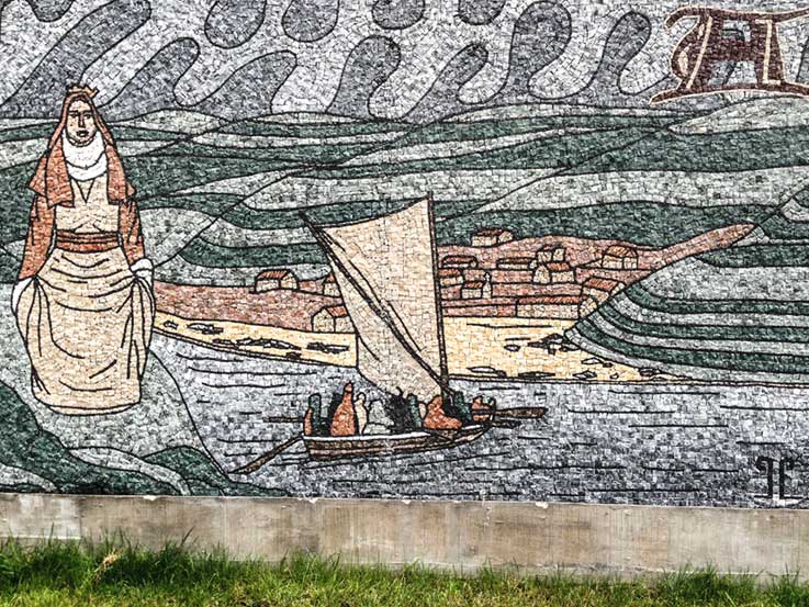 Um painel de azulejos alude à criação das Caldas pela rainha D. Leonor, perdão, pela rainha D. Mafalda, mulher de D. Afonso Henriques, que no séc. XII ali mandou construir uma albergaria para os mais necessitados. Isto porque, tal como noutras futuras Caldas, havia por ali umas poças com águas quentes onde os que nelas se banhavam sentiam efeitos curativos milagrosos.