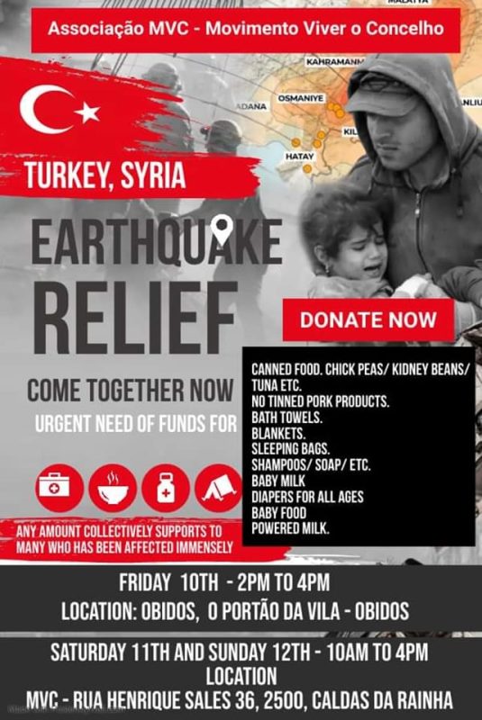 A Associação MVC – Movimento Viver o Concelho, em parceria com a Silver Coast Volunteers Association, está a realizar uma angariação de bens para as vítimas do terramoto de magnitude 7,8 na escala de Richter que atingiu o sul da Turquia e o norte da Síria na madrugada de segunda-feira, seguido de dezenas de réplicas. A ação decorre este fim de semana, e os bens angariados serão enviados para a Embaixada da Turquia em Lisboa, face ao seu apelo nacional no passado dia 7.